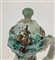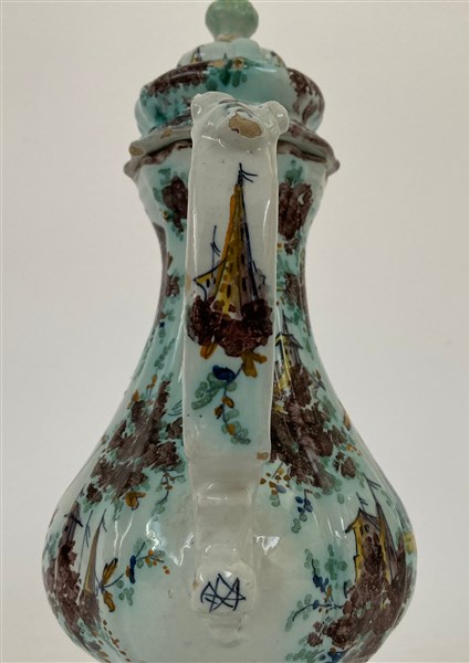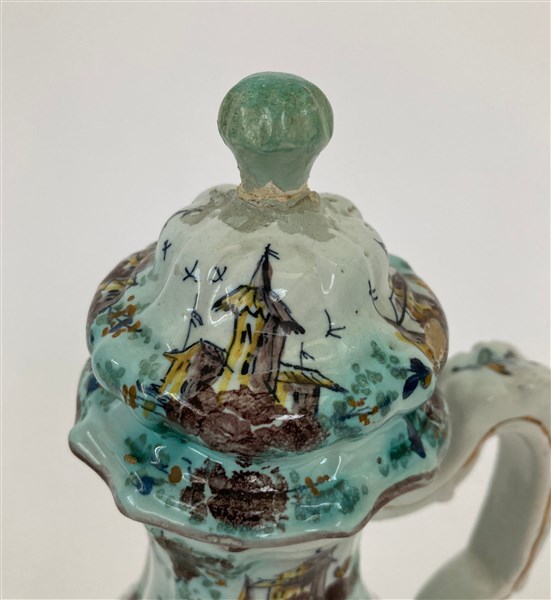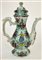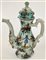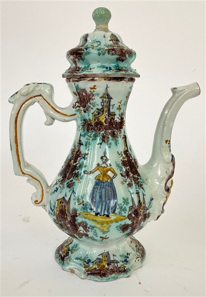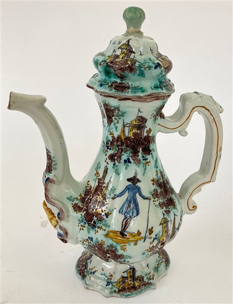 Caffettiera in ceramica dipinta in policromia con figurini, edifici ed elementi naturalistici (h cm 26) (difetti e restauri)