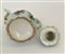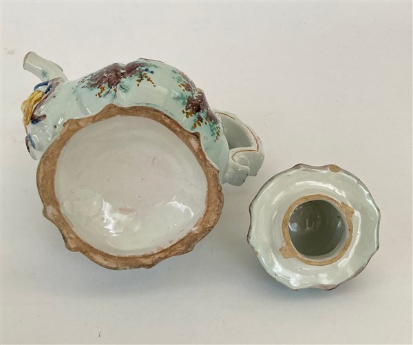Caffettiera in ceramica dipinta in policromia con figurini, edifici ed elementi