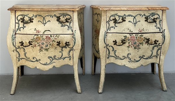 Coppia di comodini di forma mossa in legno laccato a fiori e volute fogliate dipinti in policromia. Piano laccato a finto marmo (cm 64x67x38) (difetti e mancanze)