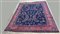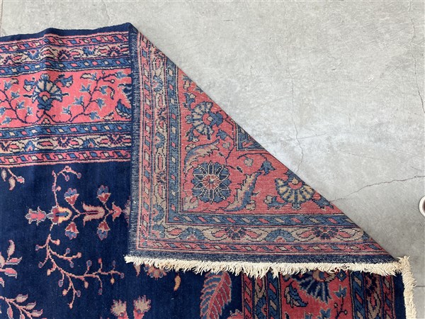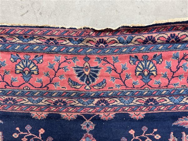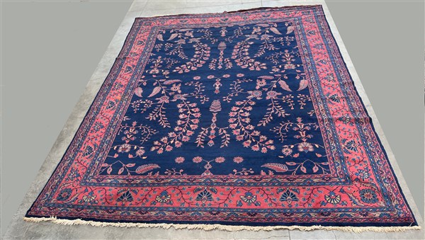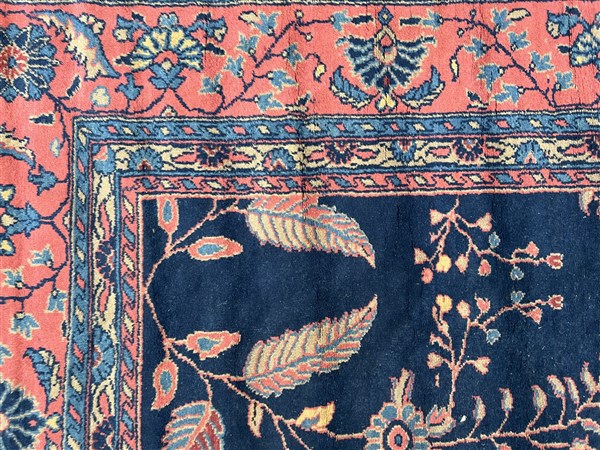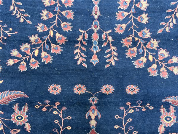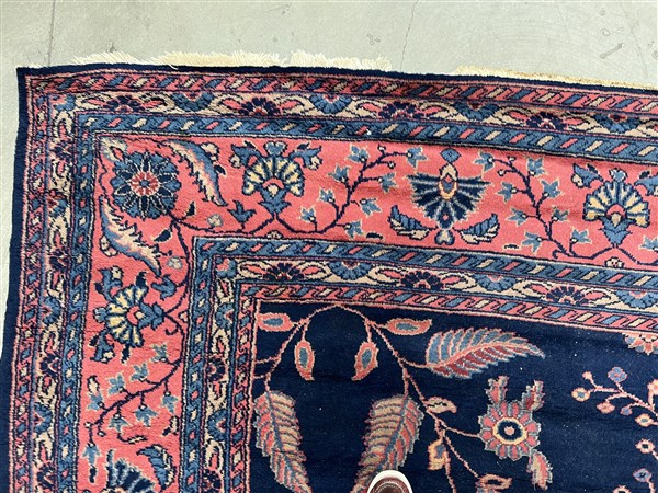 Tappeto Sparta, Anatolia, secolo XX. Decoro floreale sparso con rami fioriti nei toni del rosa, azzurro e beige su fondo blu notte. Bordura a meandro su fondo rosa (cm (lievi difetti)