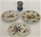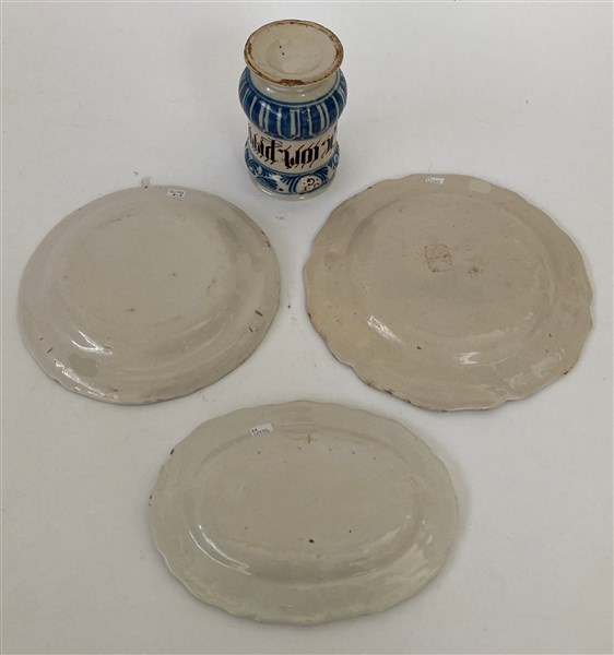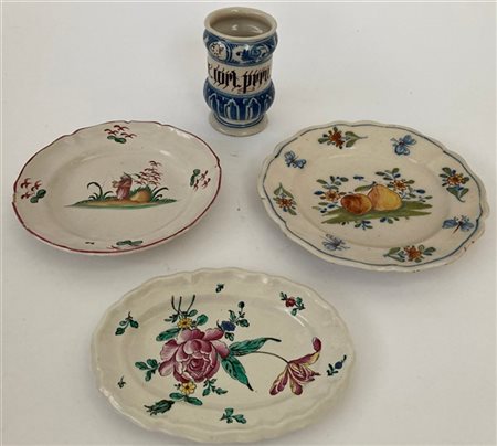 Manifatture differenti, lotto di tre piatti in ceramica policroma decorati a piccolo fuoco con elementi naturalistici (d max 24,5), uniti ad un albarello (h cm 13) secolo XVIII-XIX (difetti)