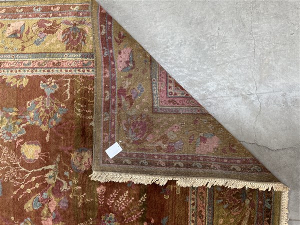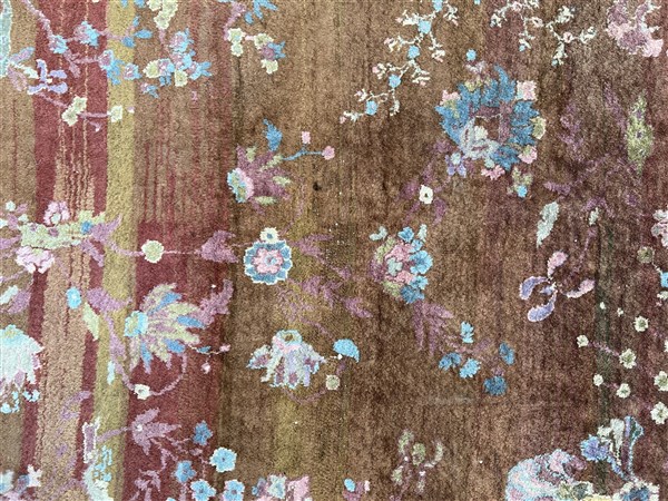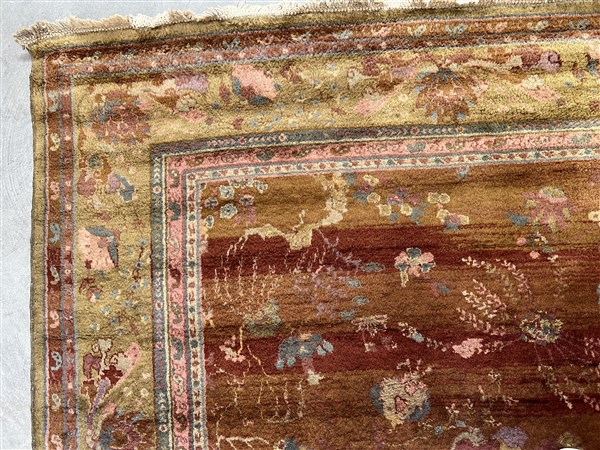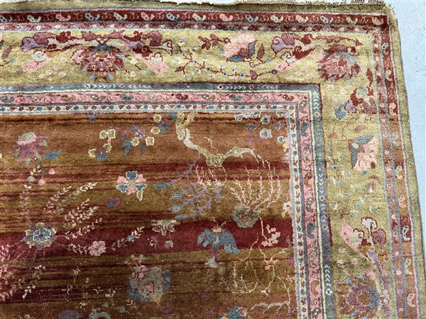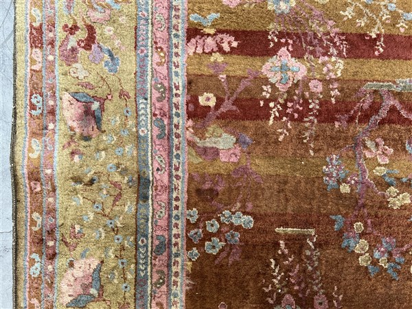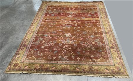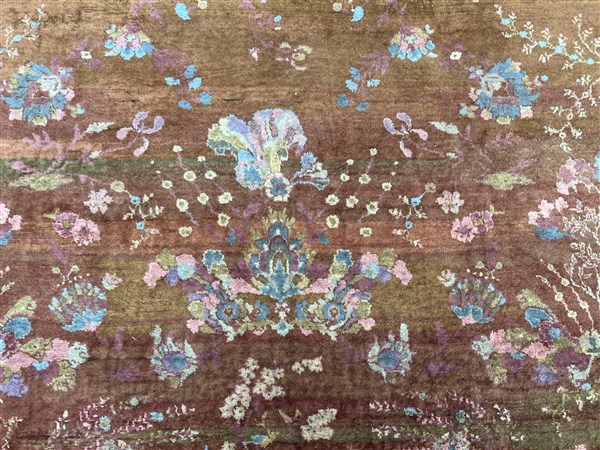 Tappeto Tabriz, Persia, secolo XX. Decoro floreale sparso nei toni del rosa, azzurro, lavanda e verde chiaro su fondo variegato color camoscio e tabacco (cm (difetti e rapature)