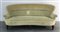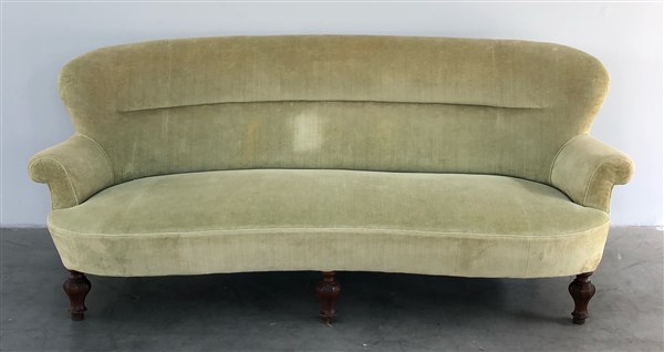 Divano di forma sagomata rivestito in velluto verde, piedi in legno tornito (difetti)