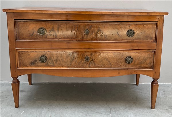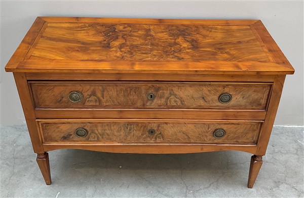 Cassettone lastronato e filettato in legni vari, fronte a due cassetti, gambe r
