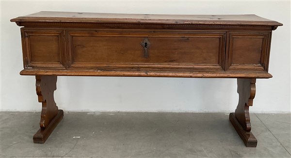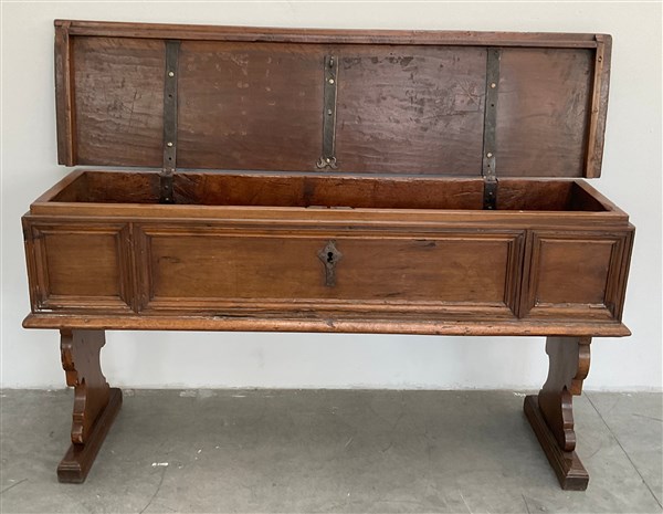 Antica cassapanca in legno intagliato con gambe sagomate (cm 158x80x41) (difetti)