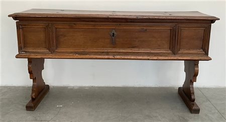 Antica cassapanca in legno intagliato con gambe sagomate (cm 158x80x41) (difett
