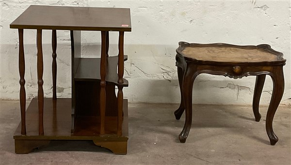 Lotto composto da un portariviste in legno sostegni torniti, piedi terminanti a rotelle e un tavolino in legno di forma mossa (difetti)