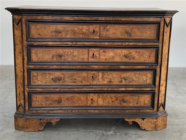 Cassettone a quattro cassetti lastronato e filettato in noce e radica di noce, profili ebanizzati e piedi a mensola. Lombardia, secolo XVIII (cm 146x112x56) (difetti)