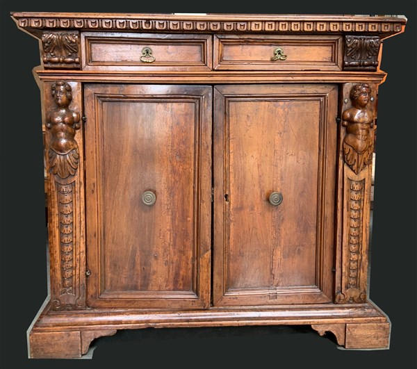 Antica credenza in legno intagliato a due cassetti sottopiano e due ante, montanti a forma di erme e piedi a mensola (cm 100x90x40) (difetti e restauri)