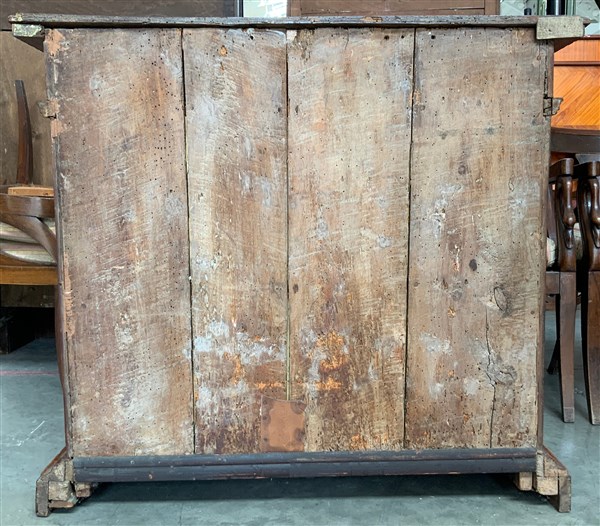 Antica credenza in legno intagliato a due cassetti sottopiano e due ante, monta