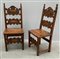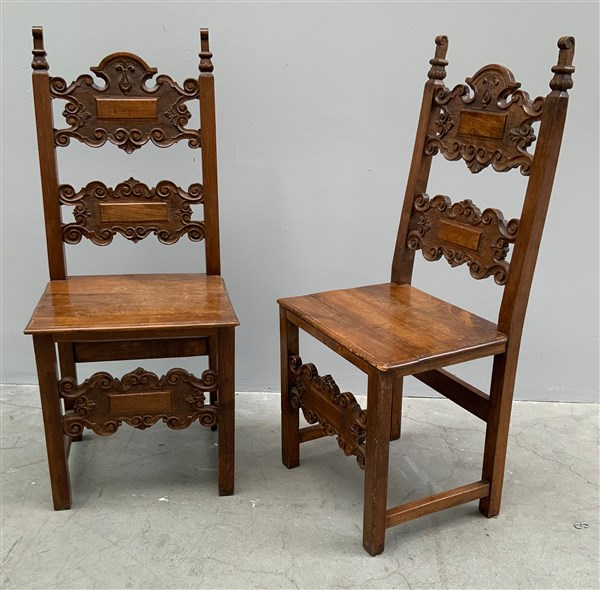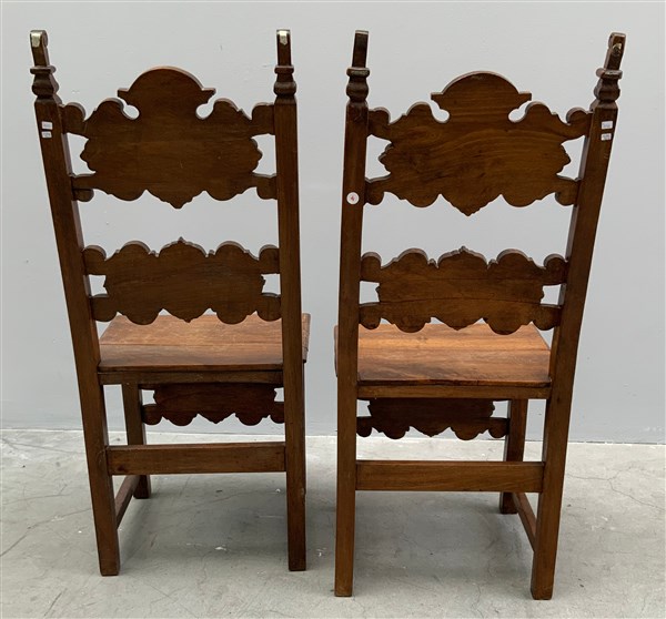 Coppia di sedie in legno intagliato con schienali a giorno centrato da cartelle