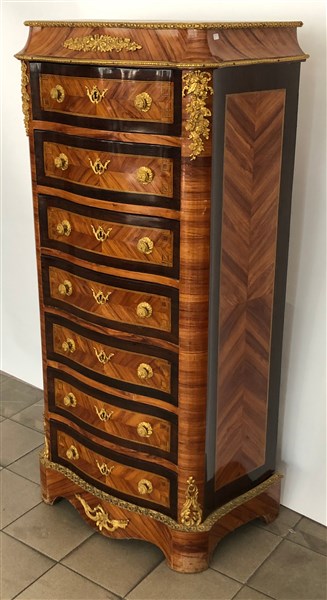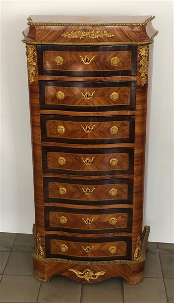 Settimanale di forma mossa radicato e filettato in legni vari decorato con applicazioni in bronzo dorato. Francia, secolo XIX (cm 63x122x34) (difetti)