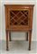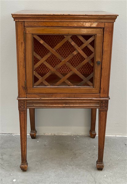 Comodino a gamba alta con anta a cancelletto, gambe rastremate decorate a rosone all'atacco (cm 41 x 72 x 31,5) (difetti e mancanze)