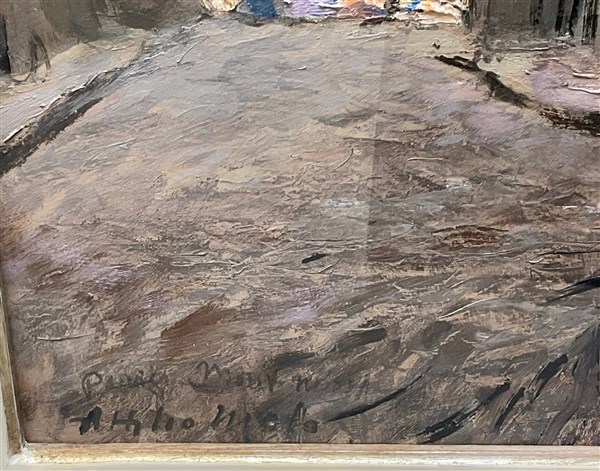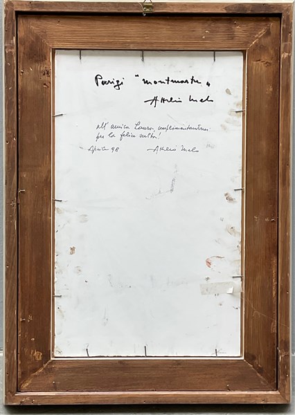 "Paris, Montmartre" olio su compensato (cm 50x29.5) Firmato e locato in basso a sinistra. Al retro: firmato, titolato e dedicato. In cornice