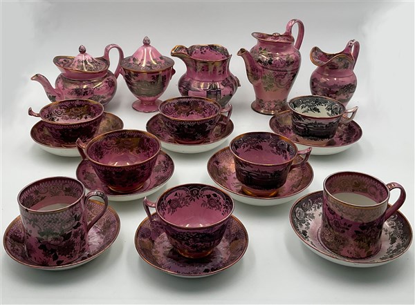 Manifatture di Davenport. Parti di servizi in porcellana a fondo rosa con profili dorati decorata da paesaggi con figure e motivi floreali, composti da teiera, sei tazze da té con piattino, cioccolatiera, lattiera, due tazze da cioccolata con piattino, brocca, zuccheriera biansata con coperchio (difetti, mancanze e restauri)