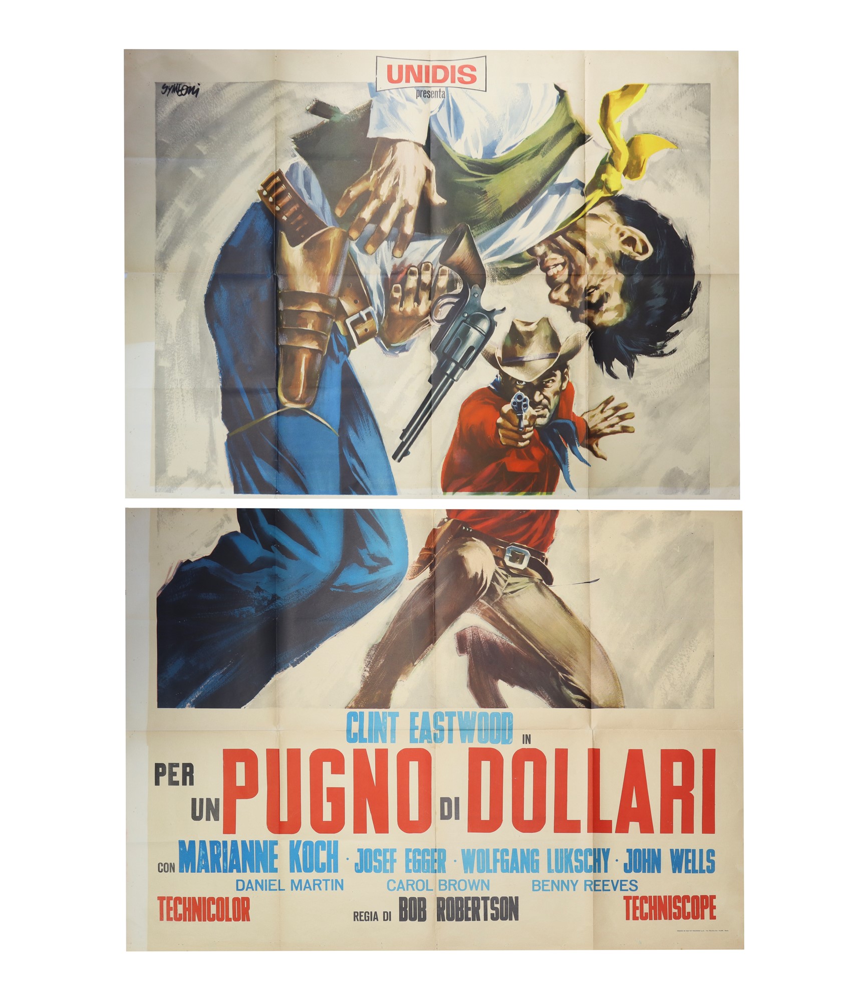Sandro Symeoni - Manifesto ''Per un pugno di dollari''cm 140 x cm 200stampa offsetPrima edizione italiana 1964. Composto da due porzioni