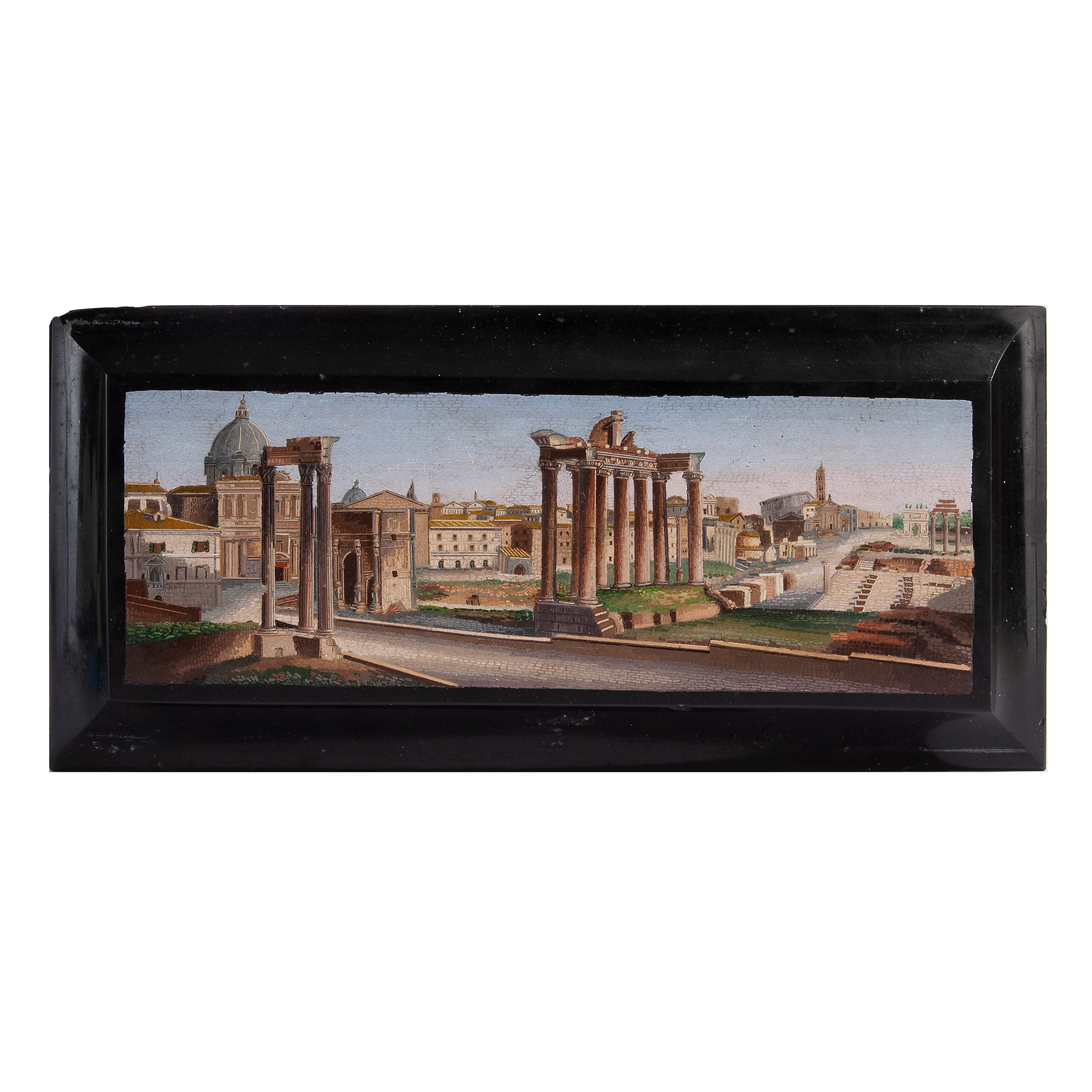 Presse-papier in micromosaico, Roma XIX secolo Manufatto raffigurante una veduta sui Fori Imperiali. Dimensioni complessive 14,5x30,5x2,3 cm., presenti difetti