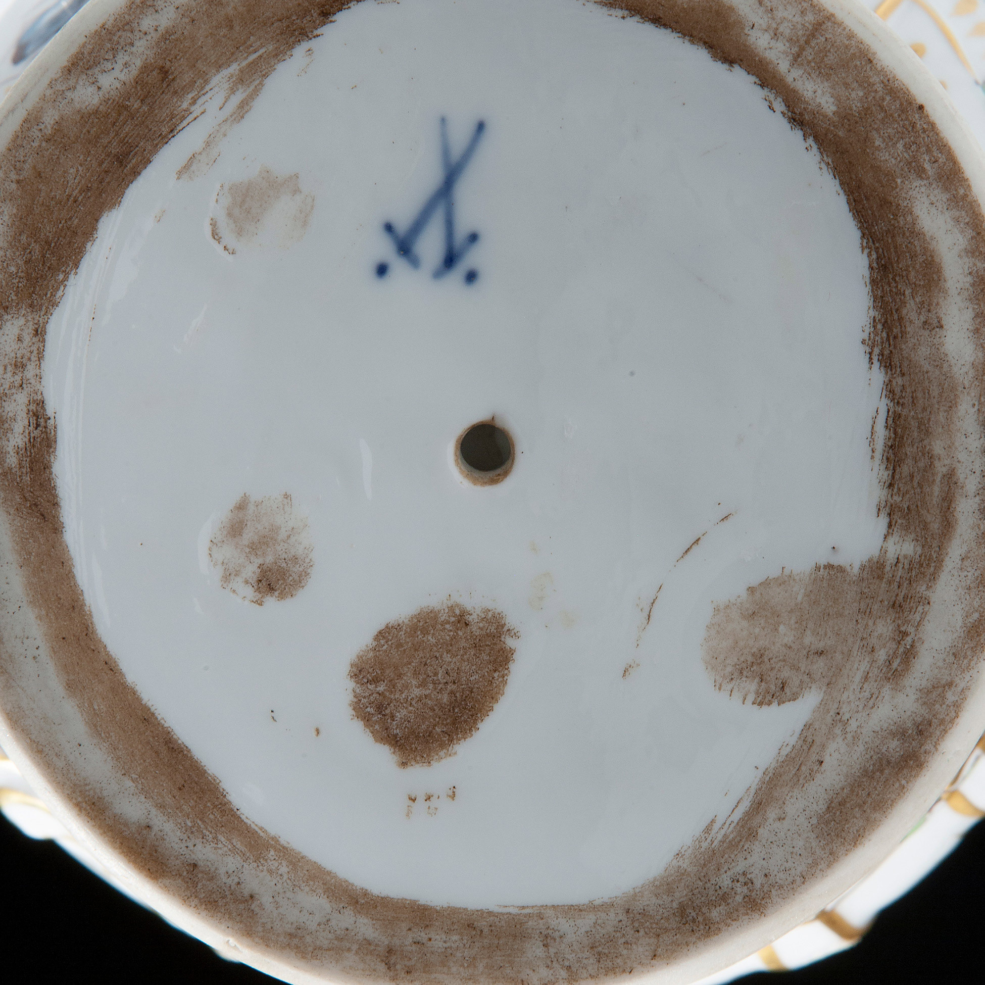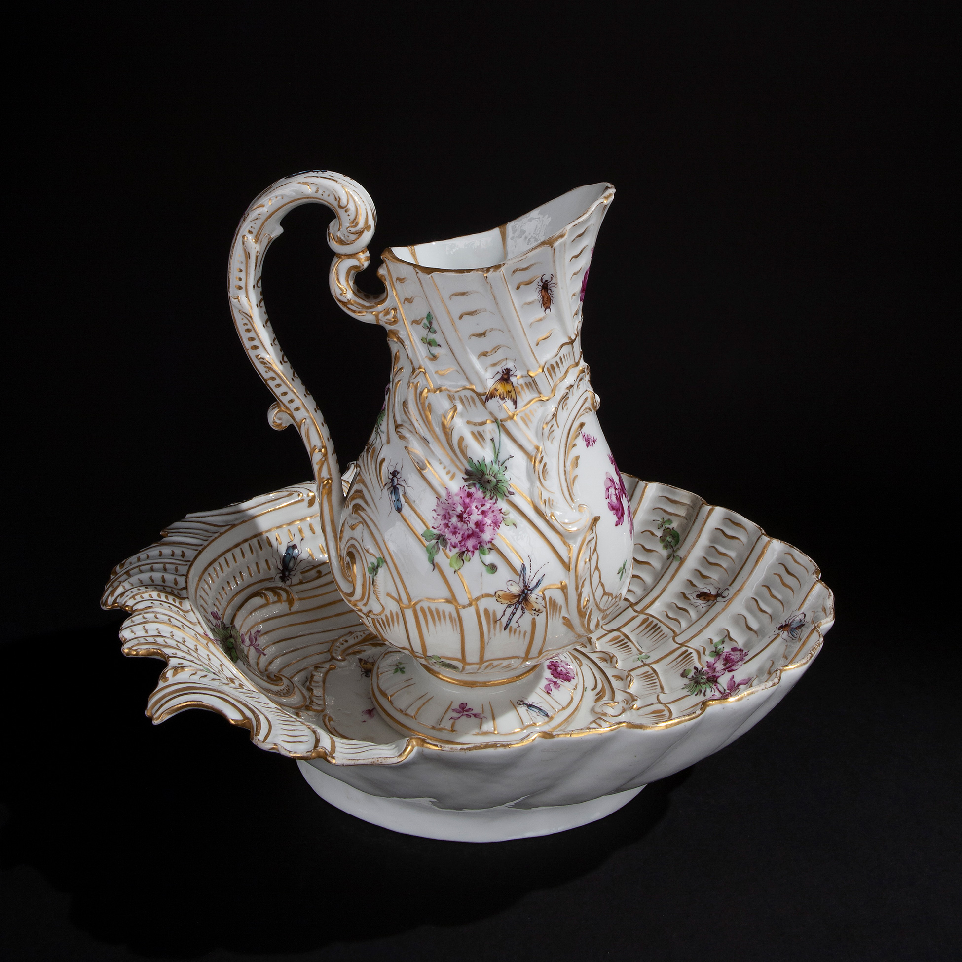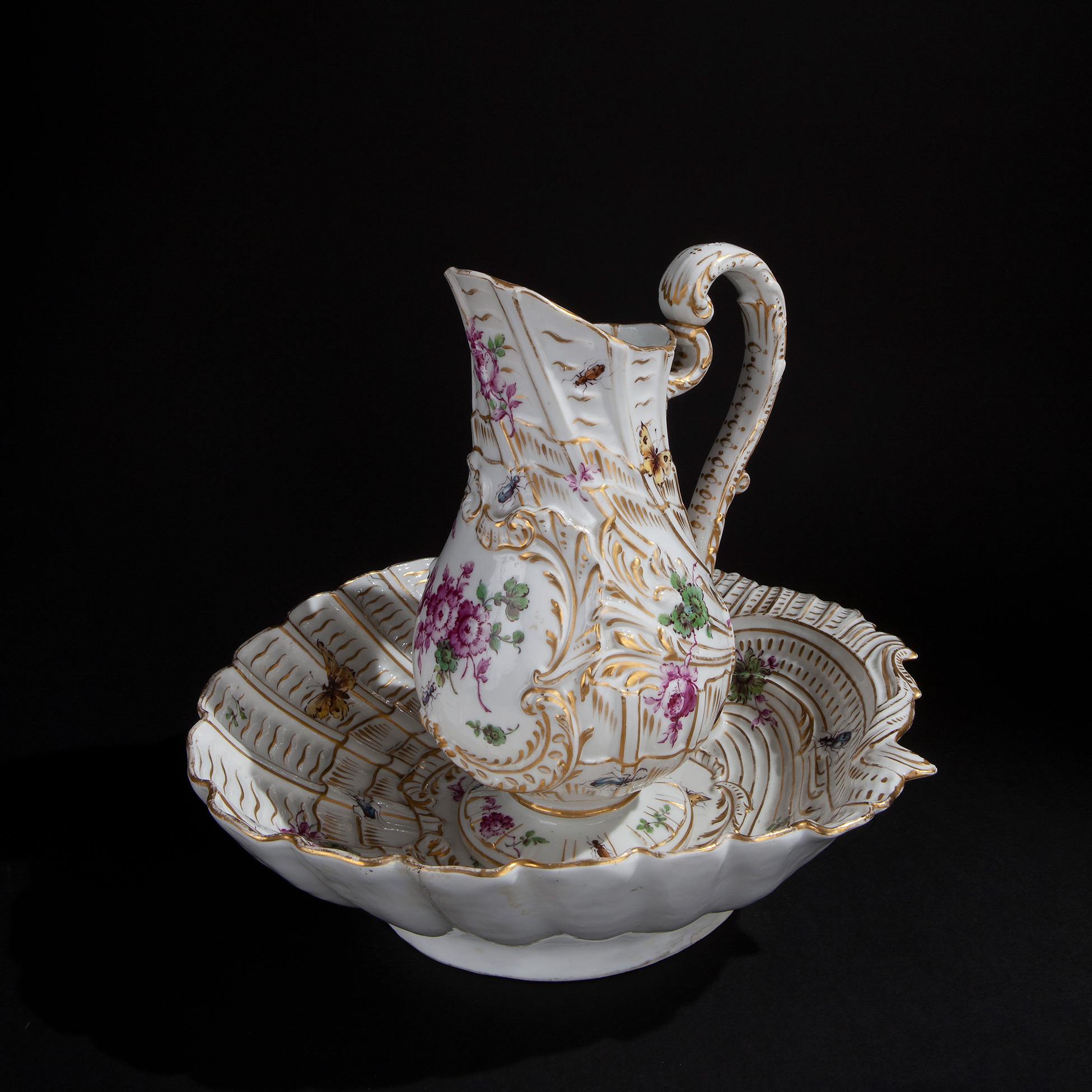 Caraffa e bacile in porcellana, Germania XVIII secolo Manifattura Meissen Kandler, decorata in fasce dorate e a motivi di fiori dipinti. Dimensioni complessive 35x30,5x26,5 cm. , presenti difetti
