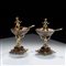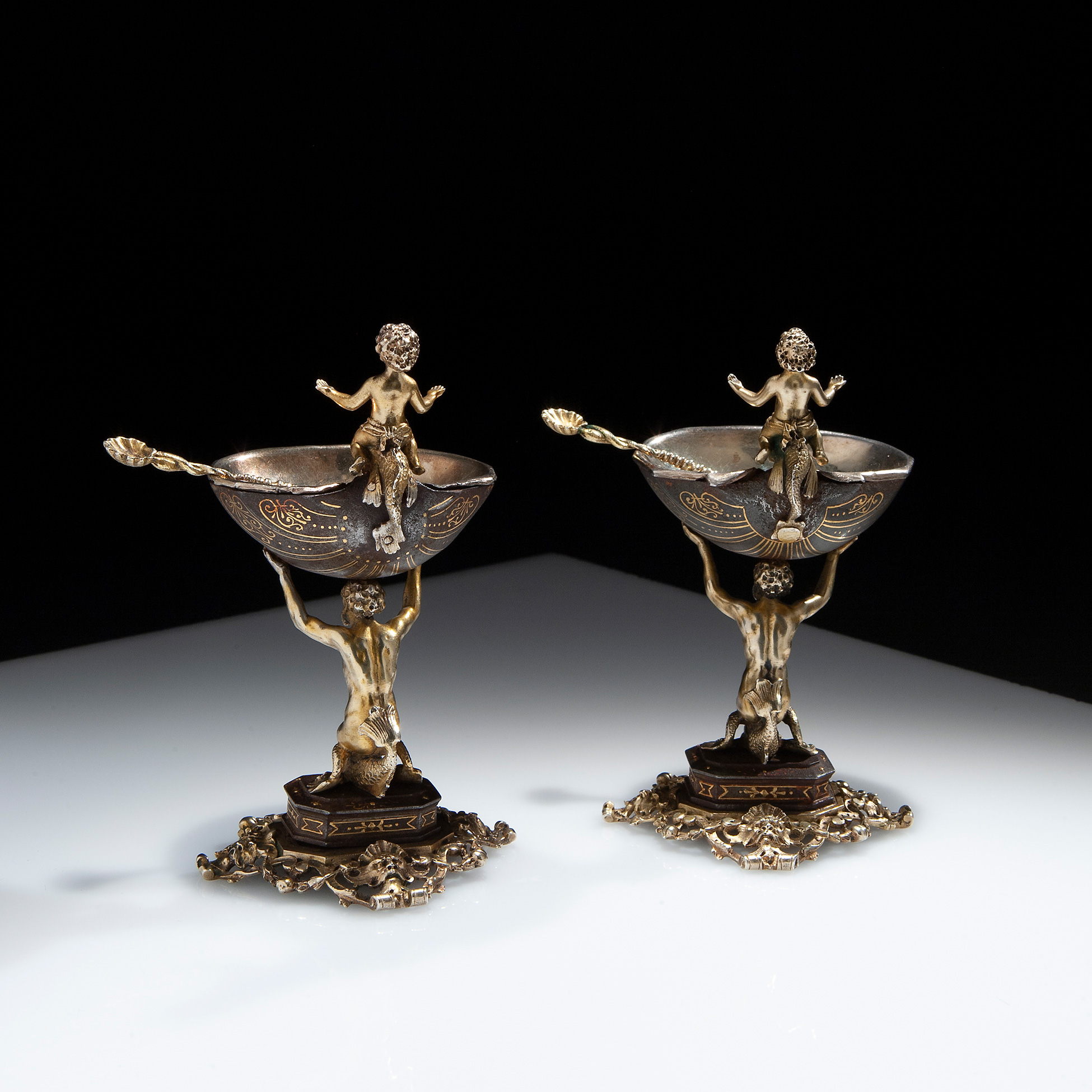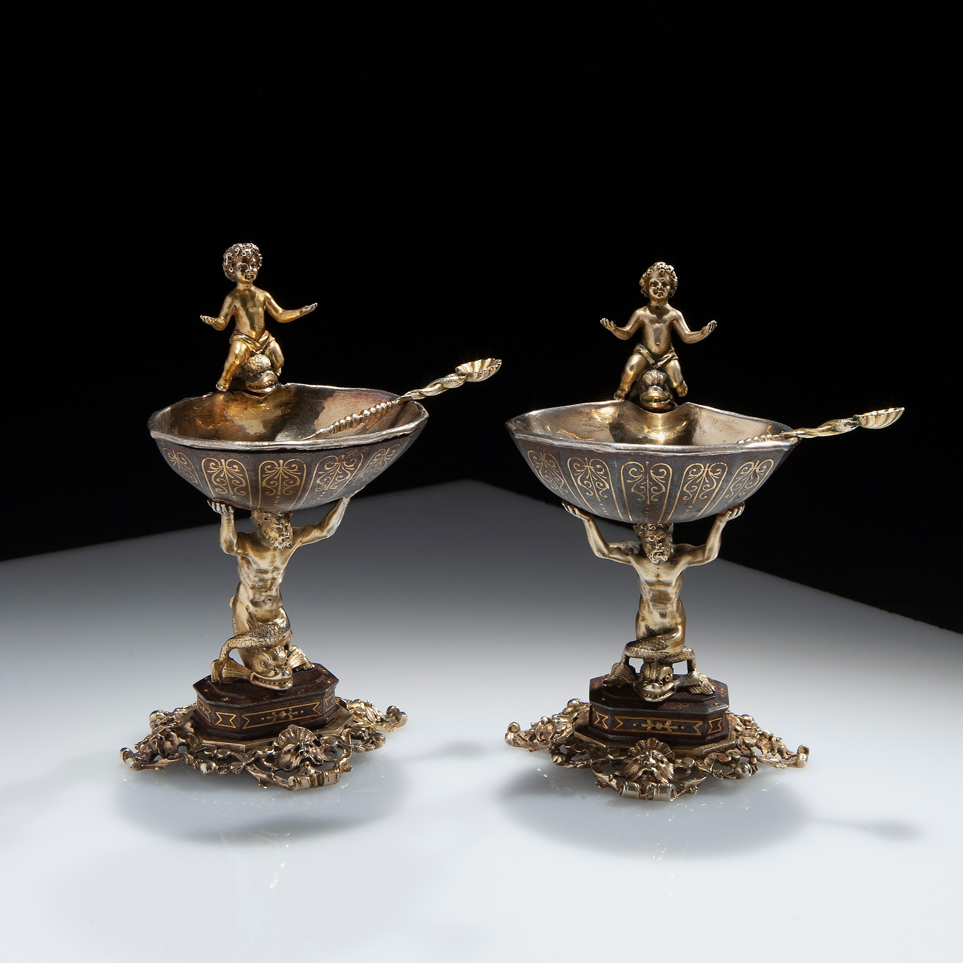 Coppia di saliere ageminate con cucchiaino, Milano 1800 Realizzate in argento dorato, peso complessivo gr. 349. Dimensioni complessive 11,5x7x8 cm., presenti difetti