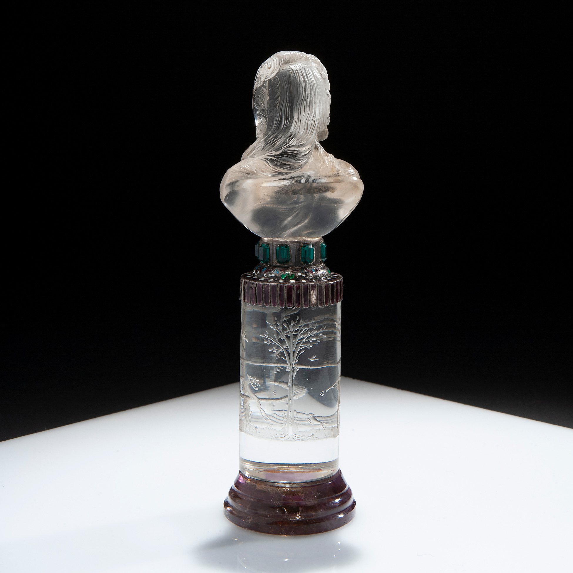 Busto di nobildonna (probabile regina Maria Antonietta?), Austria XIX secolo Base in argento smaltato, cristallo di rocca inciso e Blue Jhon. Dimensioni complessive 19x6x5,5 cm., presenti difetti