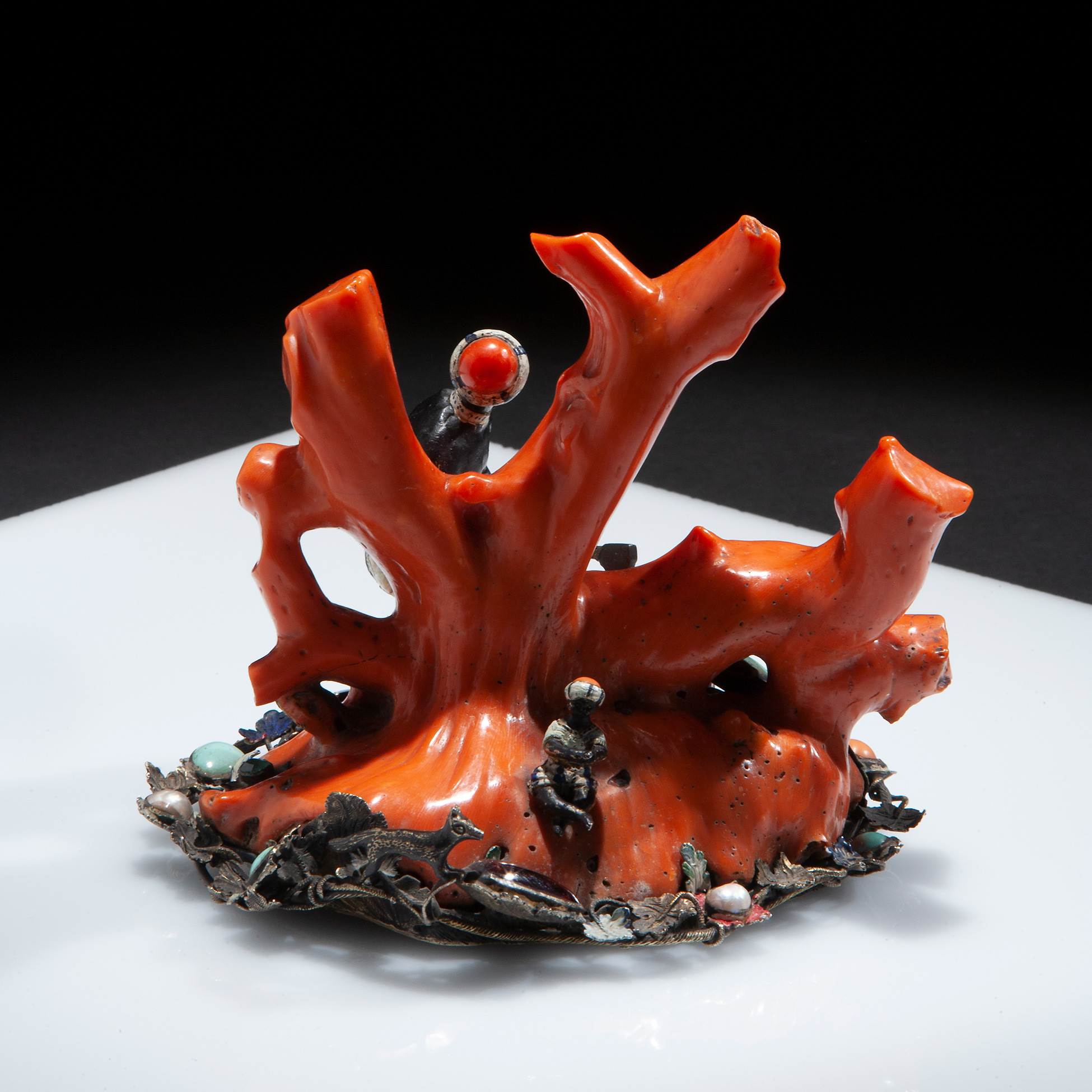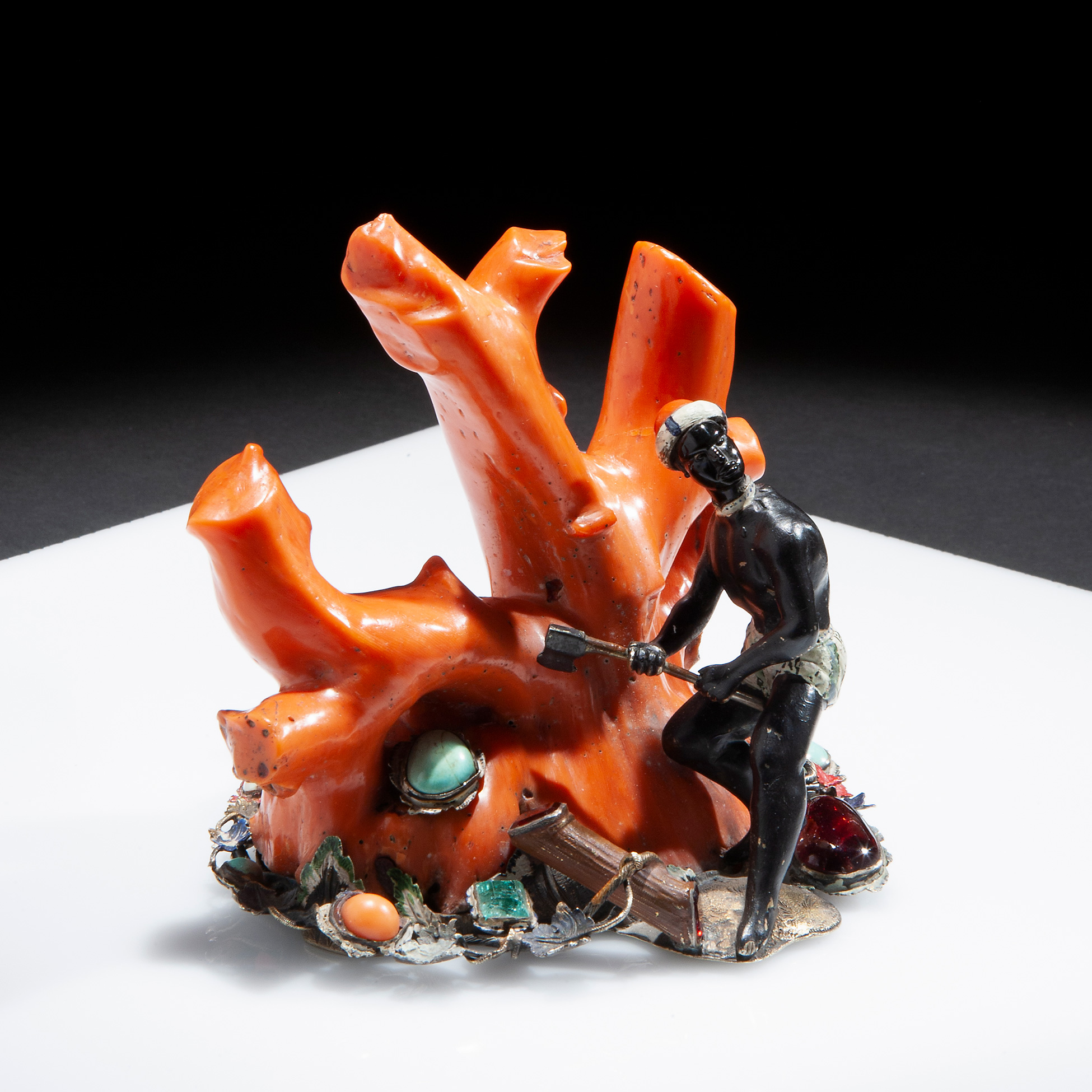 Gruppo in corallo con pietre preziose, argento e smalti, Torre del Greco XIX secolo Gruppo raffigurante una figura maschile esotica che taglia un ceppo di legno. Dimensioni complessive 11x13x10 cm., presenti difetti