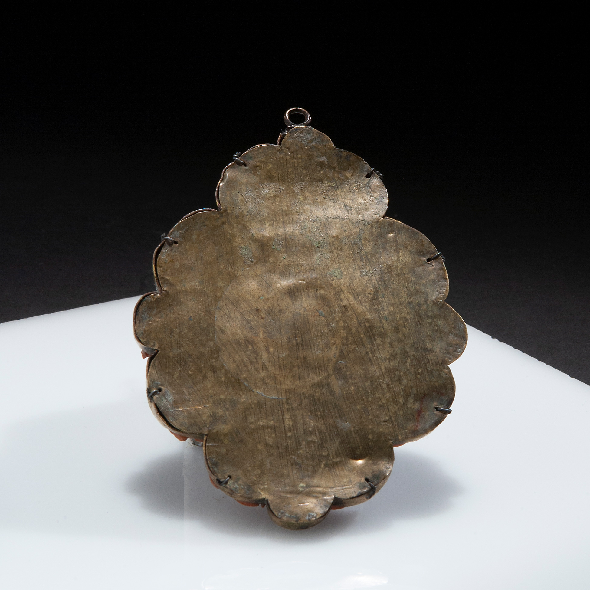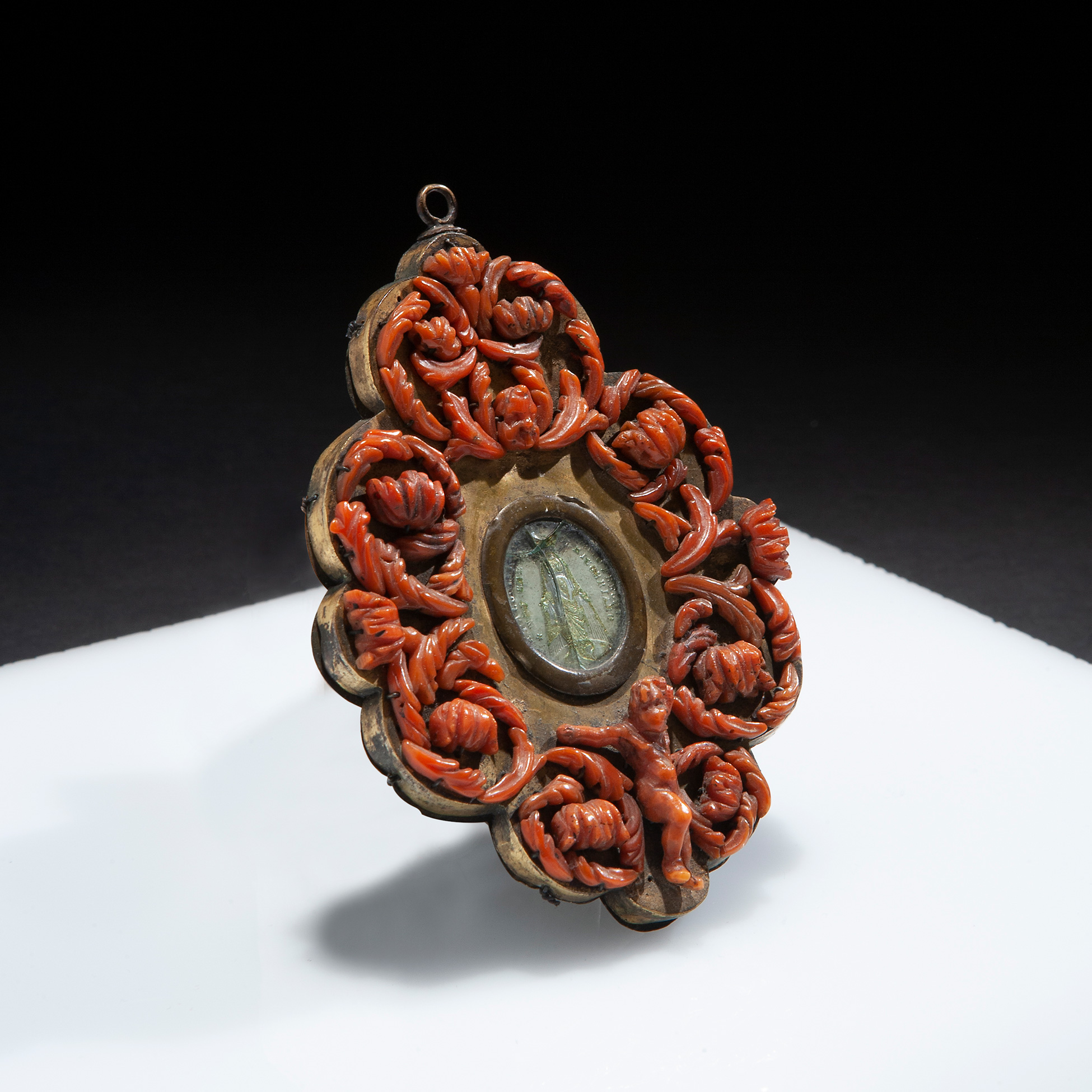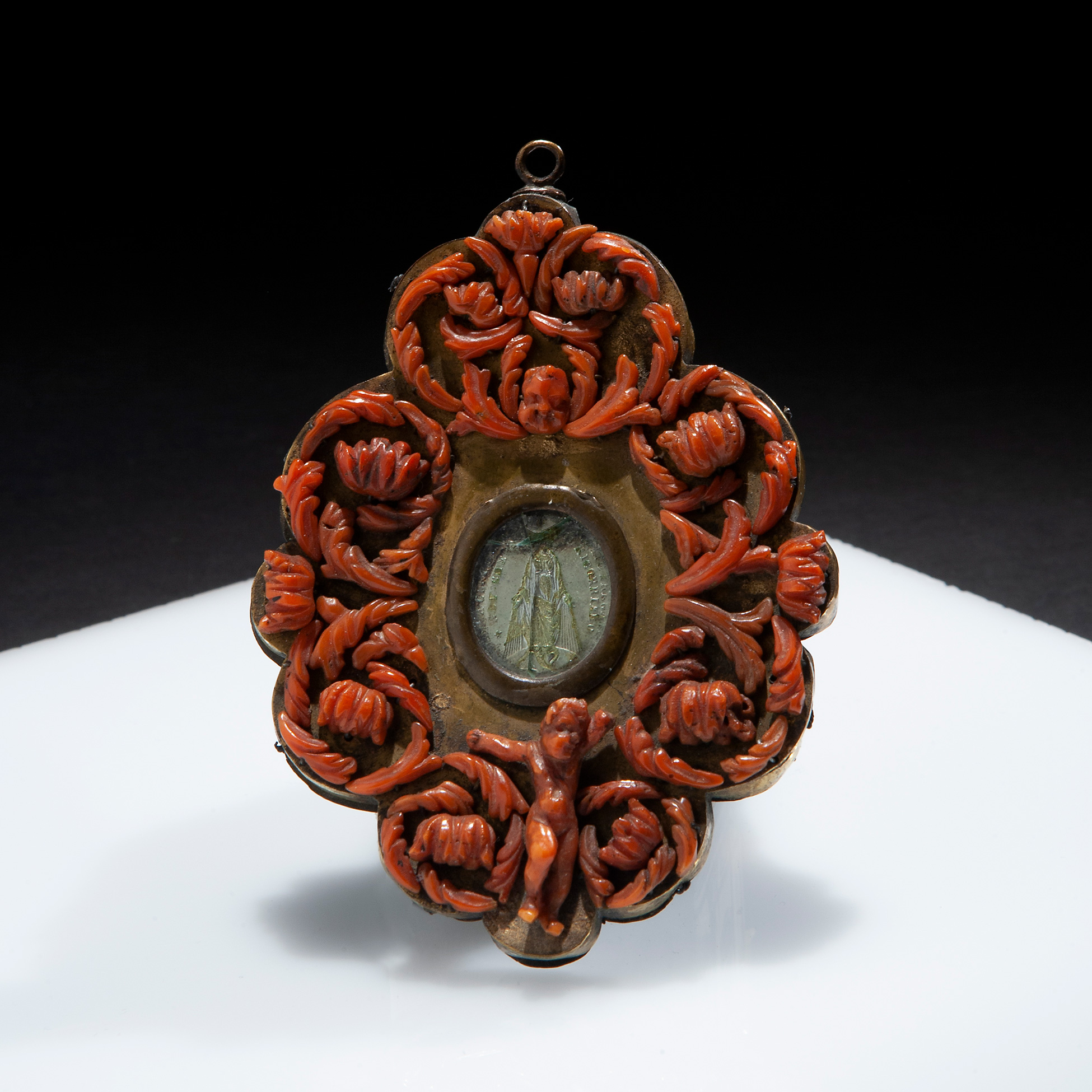 Capezzale in rame dorato, argento e corallo, Trapani XVII secolo Elemento centrale in argento raffigurante la Vergine Maria. Dimensioni complessive 10x7x0,5 cm., presenti difetti
