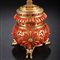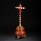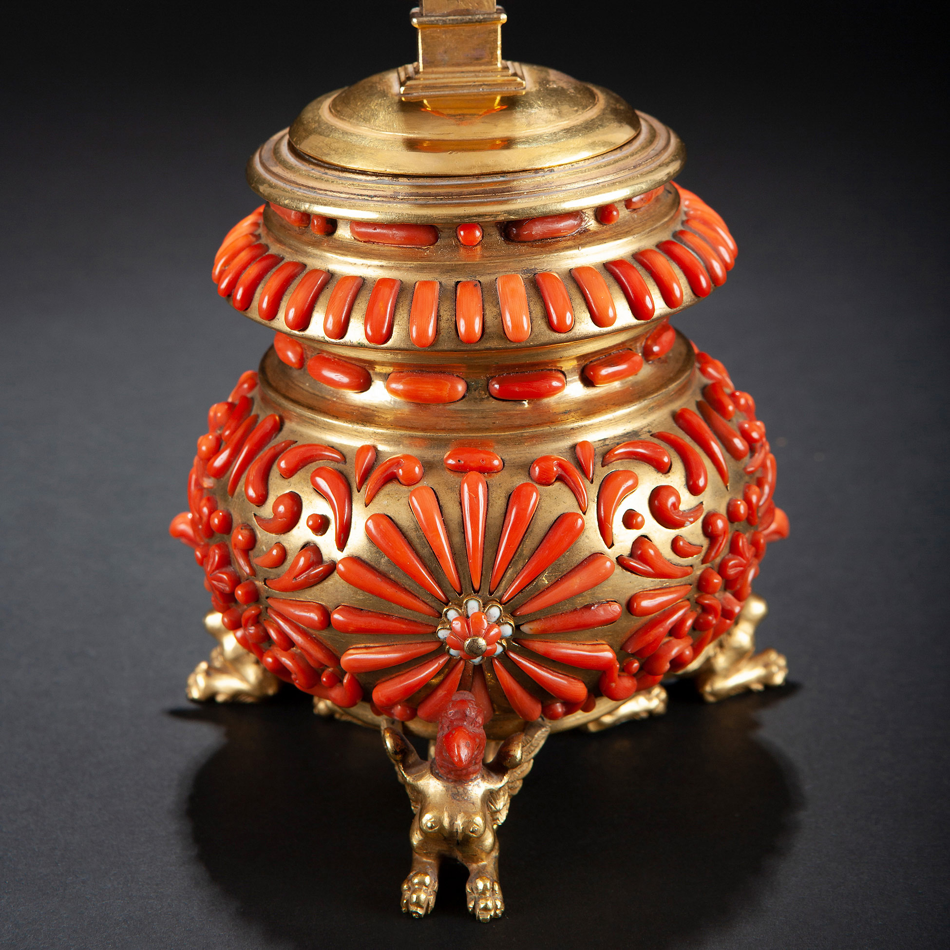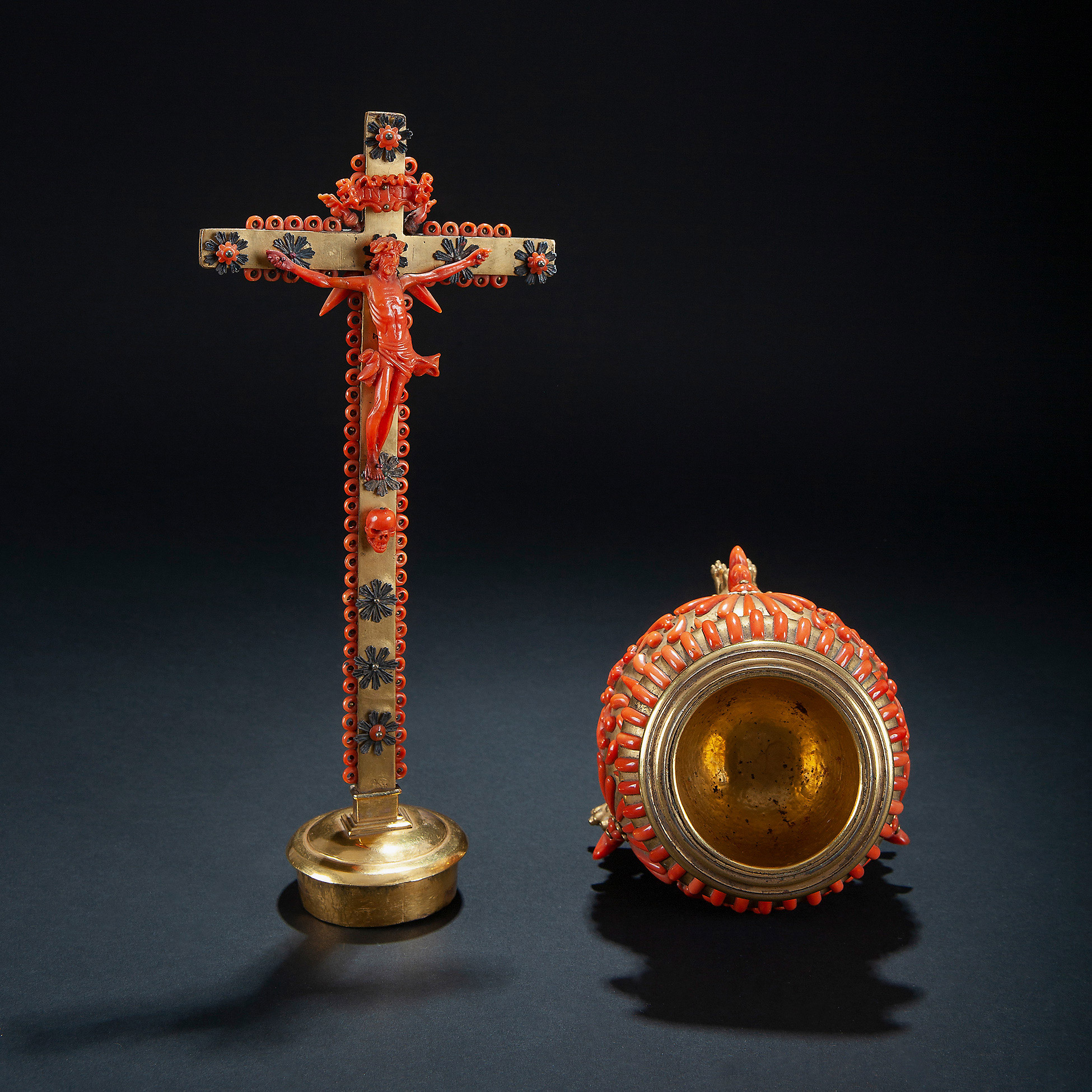 Calamaio con crocifisso in rame dorato e corallo, Trapani prima metà XVII secolo Accostabile per composizione all'esemplare conservato al Kunsthistorisches Museum di Vienna, poggia su tre sfingi in rame dorato e corallo. Il calamaio proveniene dalla collezione dell'Ing. Antonio Virga e pubblicato in 'Il corallo trapanese nei secoli XVI e XVII' a cura di Maria Concetta di Natale, Brescia 2002, p. 71. Dimensioni complessive 34x11x11 cm., presenti difetti