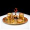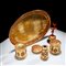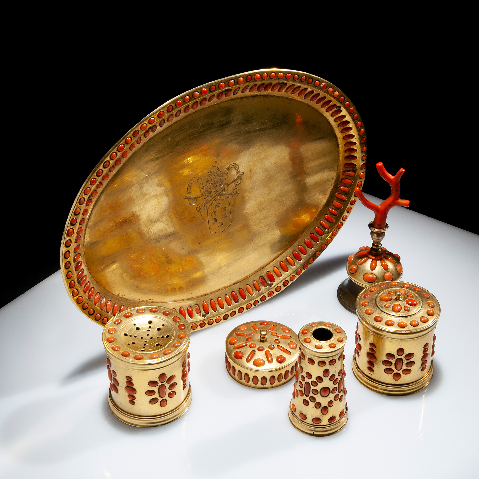 Set da scrittoio in rame dorato e corallo, Trapani prima metà del XVII secolo Parte della prestigiosa Collezione dell'Ing. Antonio Virga, il gruppo è composto da un piatto ovale in rame dorato e corallo, quattro recipienti e un campanello; il centro del vassoio reca lo stemma papale della famiglia Medici. Dimensioni complessive 13x27x20 cm., presenti difetti