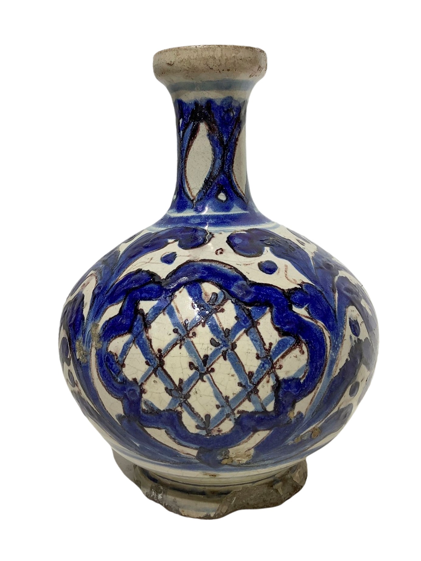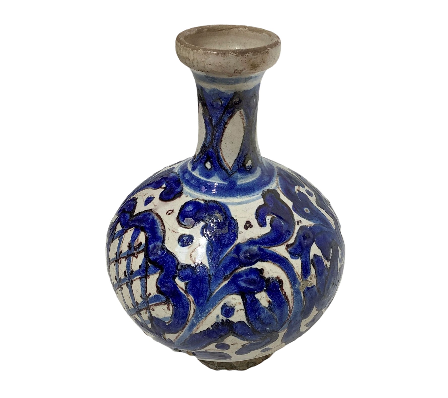 h 23 cm Bottiglia Maiolica Fondo bianco con ramage a larghe foglie che inquadrano fiori di gelsomino in blu