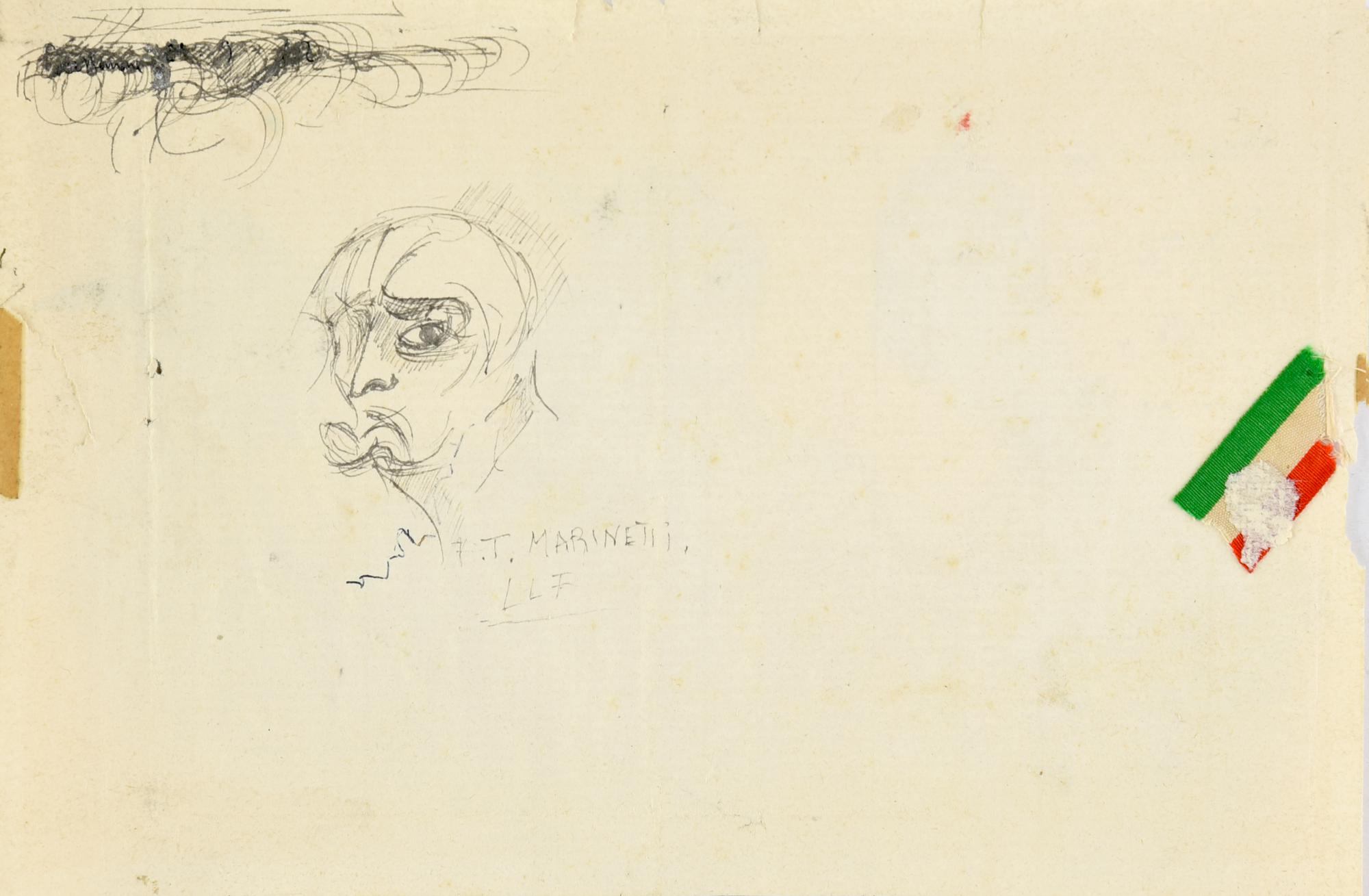 Filippo Tommaso Marinetti GRANDE E MISTERIOSO POETA disegno a biro su carta...