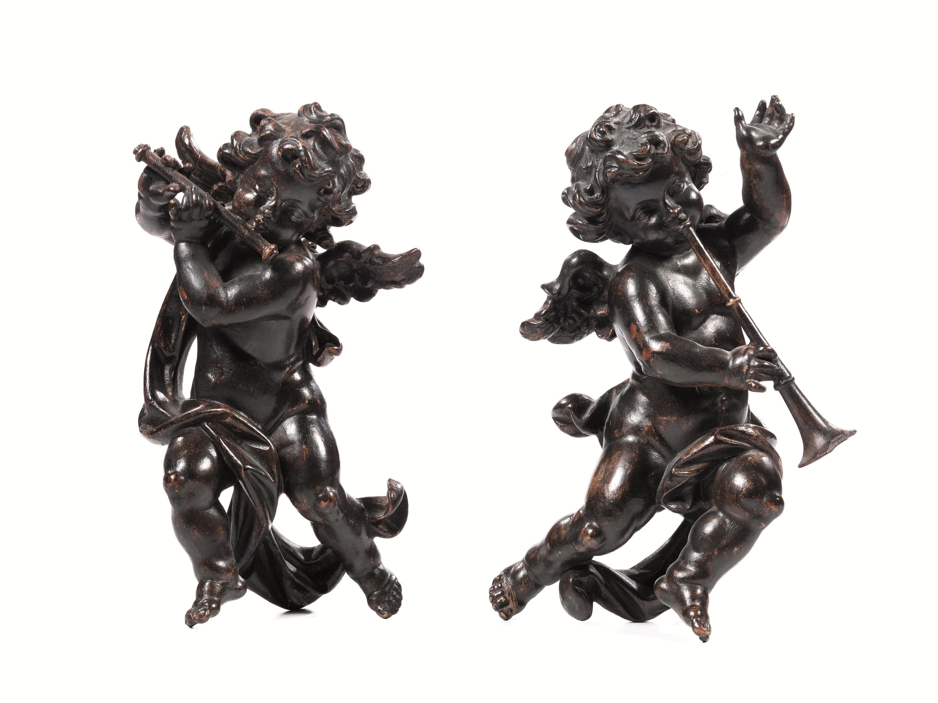 Coppia di angeli suonatori, sec. XIX, in legno intagliato, alt. cm 25, lievi danni (2)
