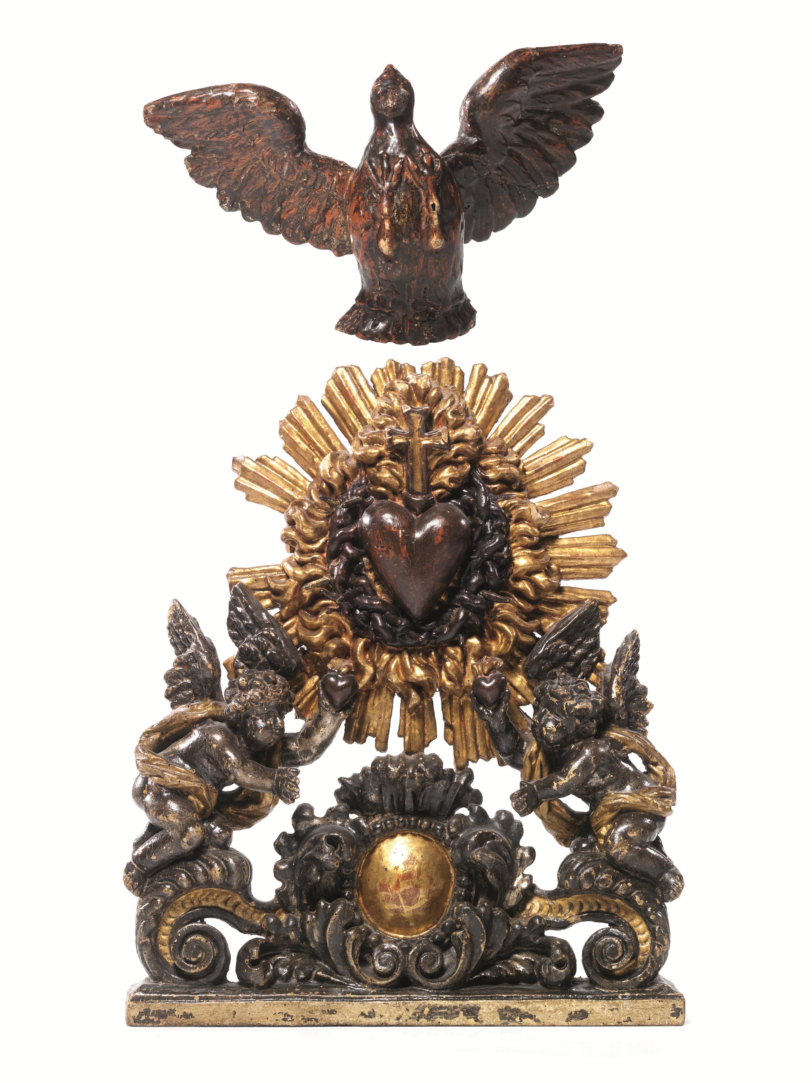 Bassorilievo, sec. XIX, in legno intagliato e dorato, al centro il Sacro Cuore entro raggiera sostenuto da due angeli genuflessi e sormontato da allegoria dello Spirito Santo, alt. cm 38