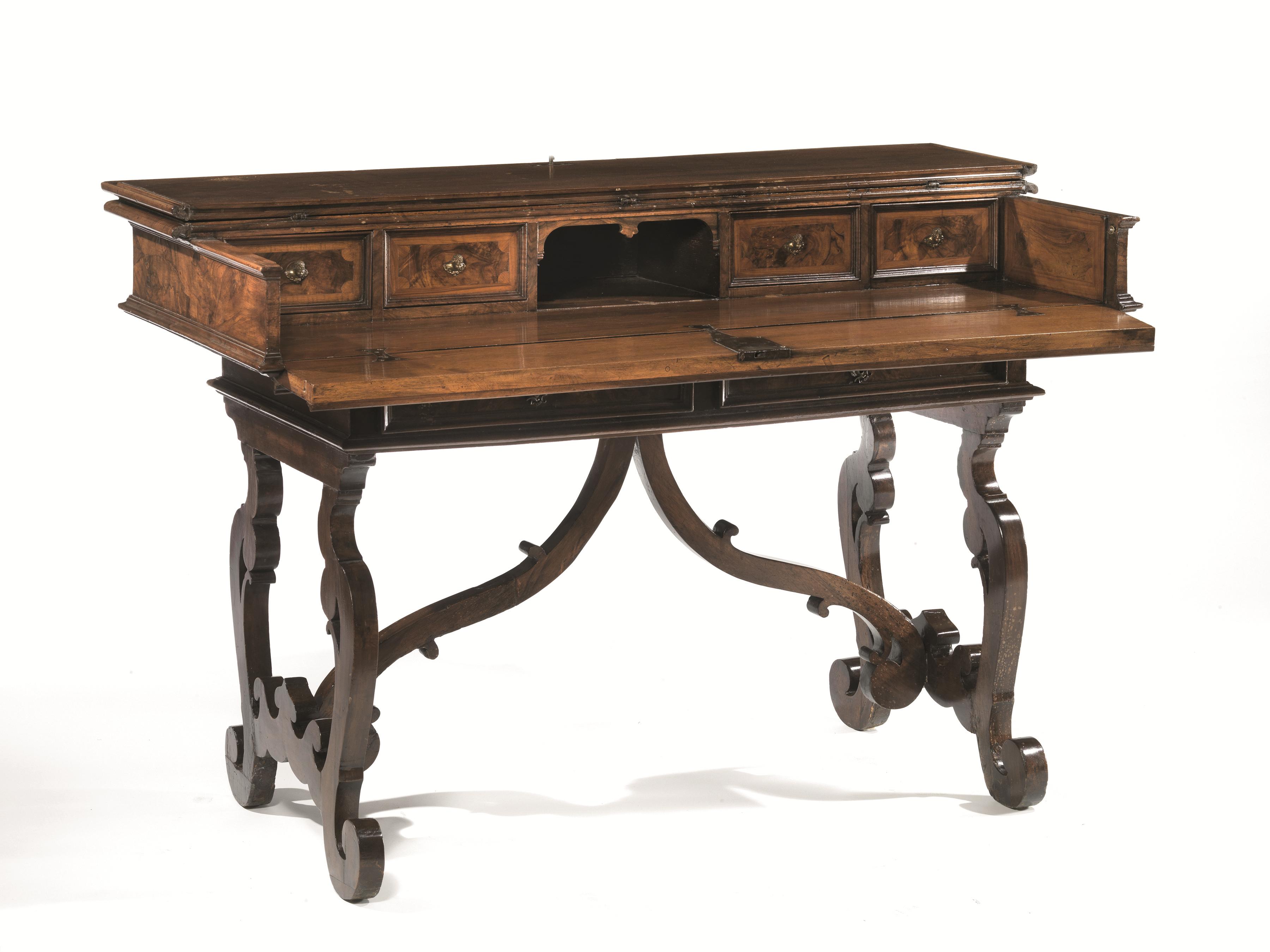Tavolo-scrivania San Filippo, in stile Seicento, in noce e radica di noce a patina scura, piano ad aprirsi, fronte a calatoio, scarabattolo interno con cassetti e vani a giorno, due cassetti nella fascia, gambe modellate a lira e riunite da sproni sagomati, cm 148x71x97, costruito con materiale antico