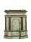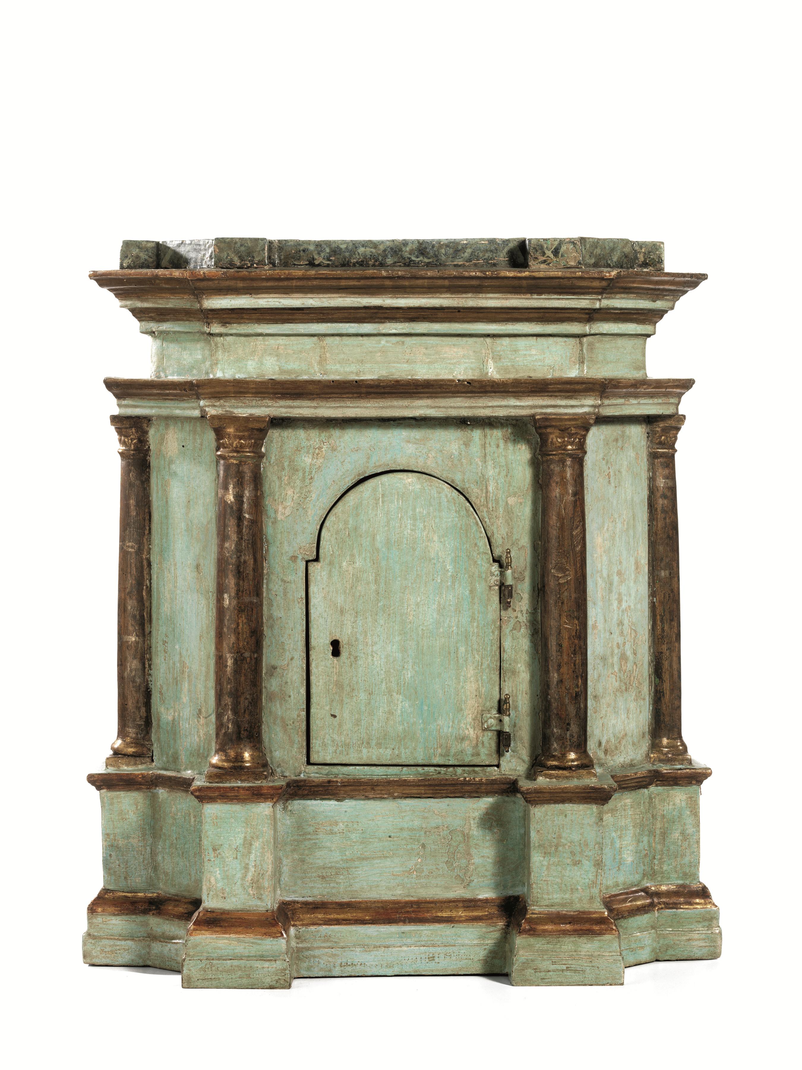 Ciborio, prima metà sec. XIX, in legno dipinto nei toni del verde ed in parte dorato, di forma sagomata con quattro colonne su ali plinti e sportellino centinato al centro, cm 50x34x65