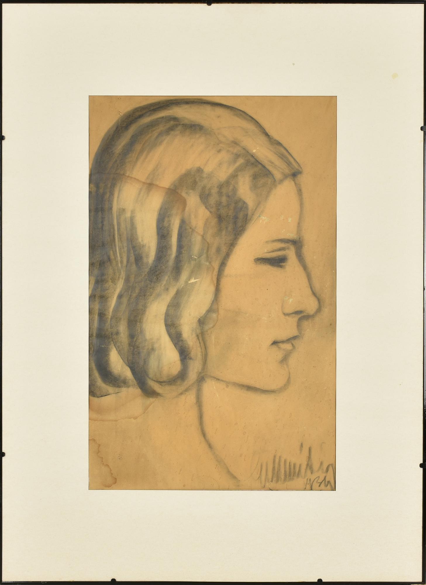 Giulio Vito Musitelli PROFILO DI DONNA carboncino su carta, cm 48x31 firma...