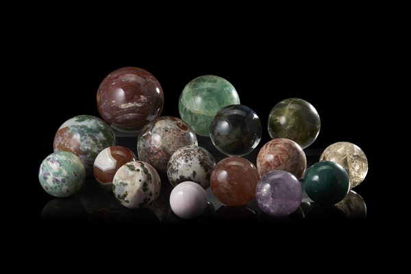 Lotto 3 | Collezione di sedici sfere in marmi, quarzi e pietre dure