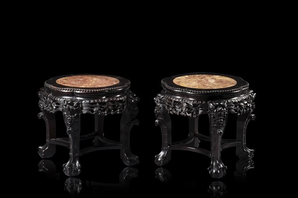 Coppia di basi portavaso con piano tondo in marmo, fascia traforata, gambe sagomate ed intagliate con piedi terminanti ad artigli che reggono sfera. Cina, secolo XX (cm 58x47) (lievi difetti)