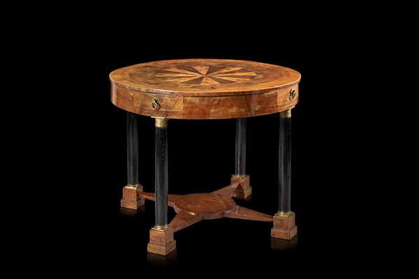 Tavolo "Impero" lastronato in noce con piano circolare intarsiato in legni vari a motivi geometrici, fascia a quattro tiretti, gambe a colonne ebanizzate decorate da capitelli in metallo dorato, riunite da piano sagomato. Secolo XIX (d. cm 96; h. cm 78) (difetti)