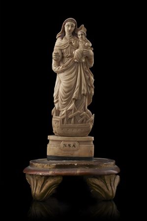 Manifattura indo-portoghese, secolo XIX "Madonna con Bambino" scultura in avori
