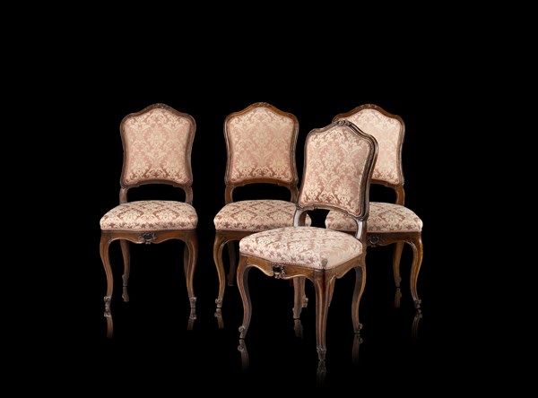 Gruppo di quattro sedie in noce intagliato a volute con schienale a cartella sagomata, fascia traforata, gambe mosse terminanti a ricciolo. Secolo XVIII (difetti)