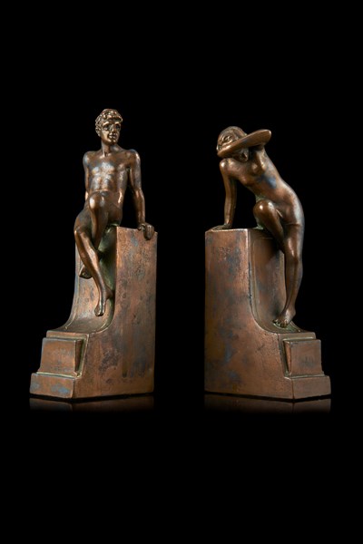 Artista dell'inizio del secolo XX. Coppia di fermalibri in rame raffiguranti nudi, iscritti Classic Art al retro (h. cm 25) (lievi difetti)