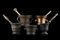 Collection of five bronze mortars of different periods and sizes, two decorated in relief with plant elements and cherub heads (h. max cm 11) (minor defects)