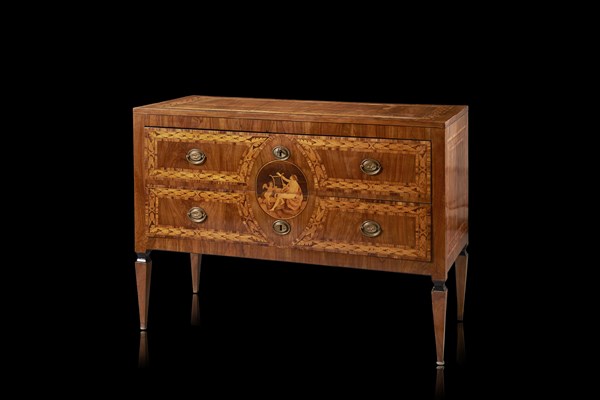 Cassettone lastronato, filettato e intarsiato in legni vari. Fronte a due cassetti centrati da cartella con Apollo e Cupido, profili decorati a foglie e ghiande. Piedi a obelisco rovesciato. Fine secolo XVIII (cm 120x91x55) (difetti)