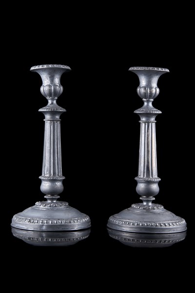 Coppia di piccoli candelieri a colonna in argento con fusto scanalato e base circolare decorata a perlinature. Punzoni di Milano, secolo XIX (h. cm 21) (g 400)