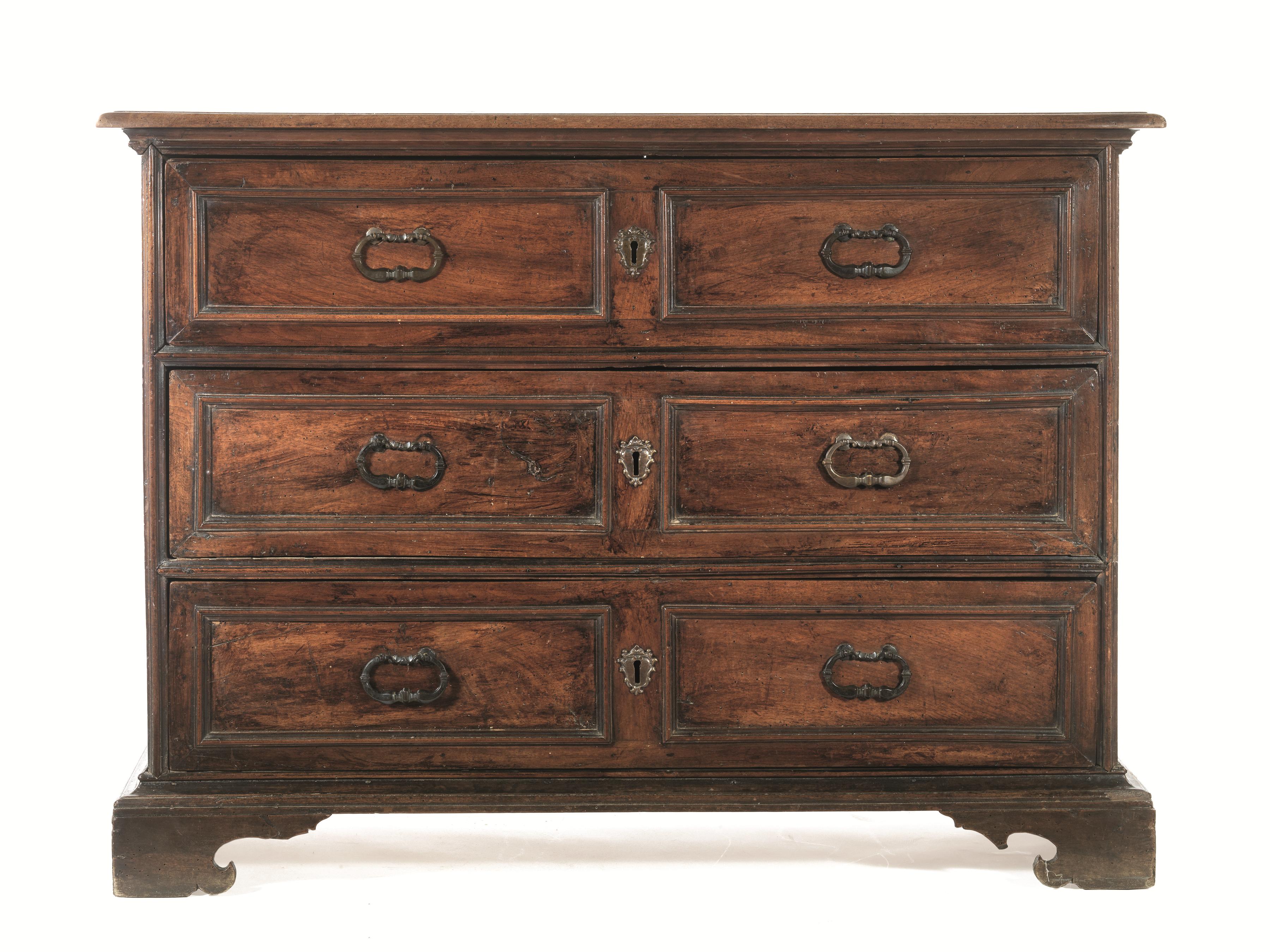 Cassettone, Firenze, metà sec. XVII, in noce, piano rettangolare con becco di civetta, tre cassetti sformellati, base modanata, piedi a mensola, cm 143x58x108