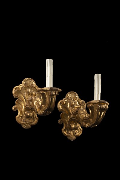 Coppia di grandi braccia portacero in legno intagliato e dorato a volute fogliate e valve di conchiglia. Secolo XVII (h. cm 46; L. cm 60) (difetti e mancanze)