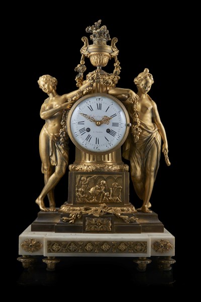 ROBIN À PARIS. Orologio da appoggio in bronzo dorato e marmo con cassa decorata a figure allegoriche e ghirlande. Quadrante in smalto bianco a numeri romani per le ore e arabi per i minuti. Sul fronte una placca cesellata con allegoria delle arti e dell'astronomia. Francia, terzo quarto del secolo XIX (h. cm 56) (difetti)