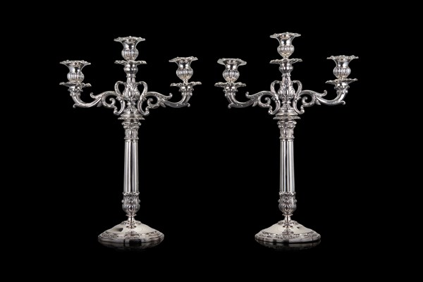 Coppia di candelieri in argento a tre fiamme con braccia portacandele cesellate a volute fogliate, fusto a colonna scanalata con capitelli sbalzati, base di forma circolare. Milano, secolo XIX. Argentiere Francesco Ceppi (h. cm 43) (g lordi 1900) (lievi difetti)