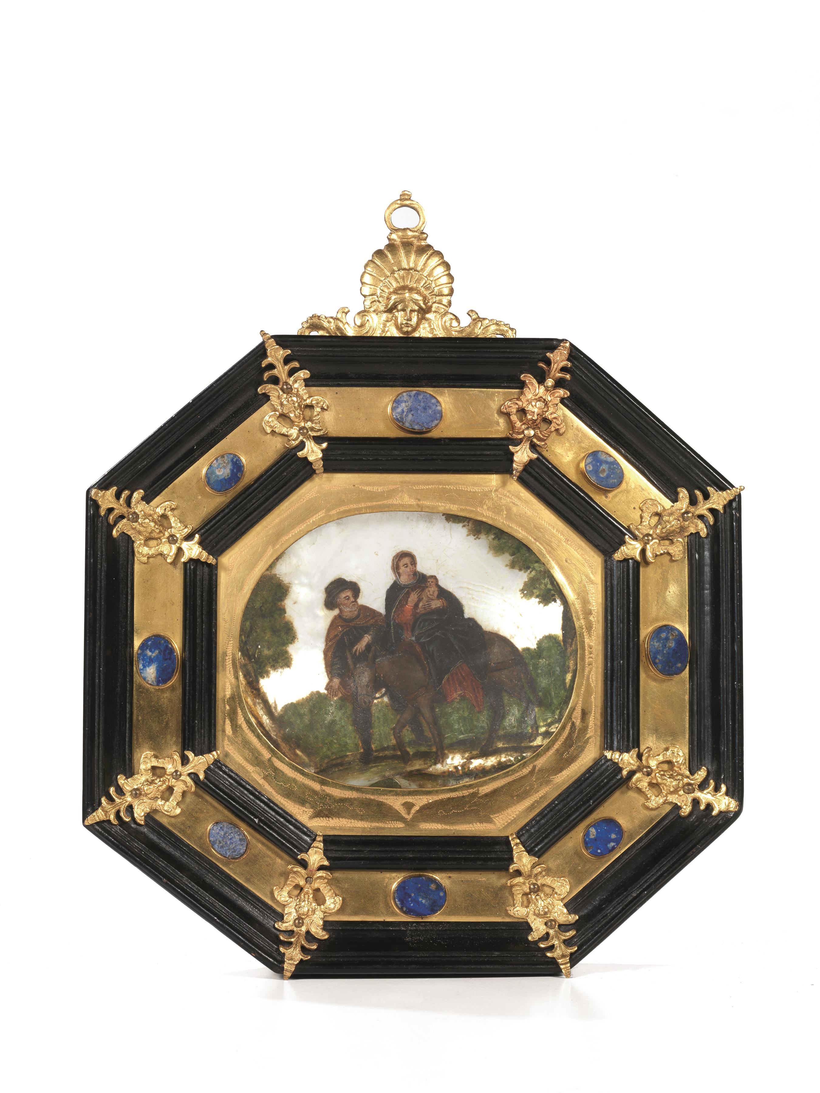 Cornice, Firenze, prima metà sec. XVIII, di forma ottagonale in legno ebanizzato, bronzo e metallo dorati, cesellati con testine alate e incisi con festoni stilizzati e con pannelli ovali in lapislazzuli contenente un dipinto su madreperla con la Fuga in Egitto, cm 25X21,6 la cornice, cm12,5x13,5 la madreperla