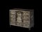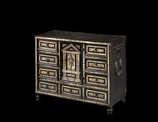 Monetiere in legno ebanizzato a sette cassetti di cui uno in linea nella base e anta centrale. Fronte interamente intarsiato in avorio a paesaggi con figure, elementi stilizzati e guerriero nella parte centrale entro cornice architettonica. Anse in bronzo e piedi torniti. Secolo XVII (cm 71x54x30) (difetti e mancanze)